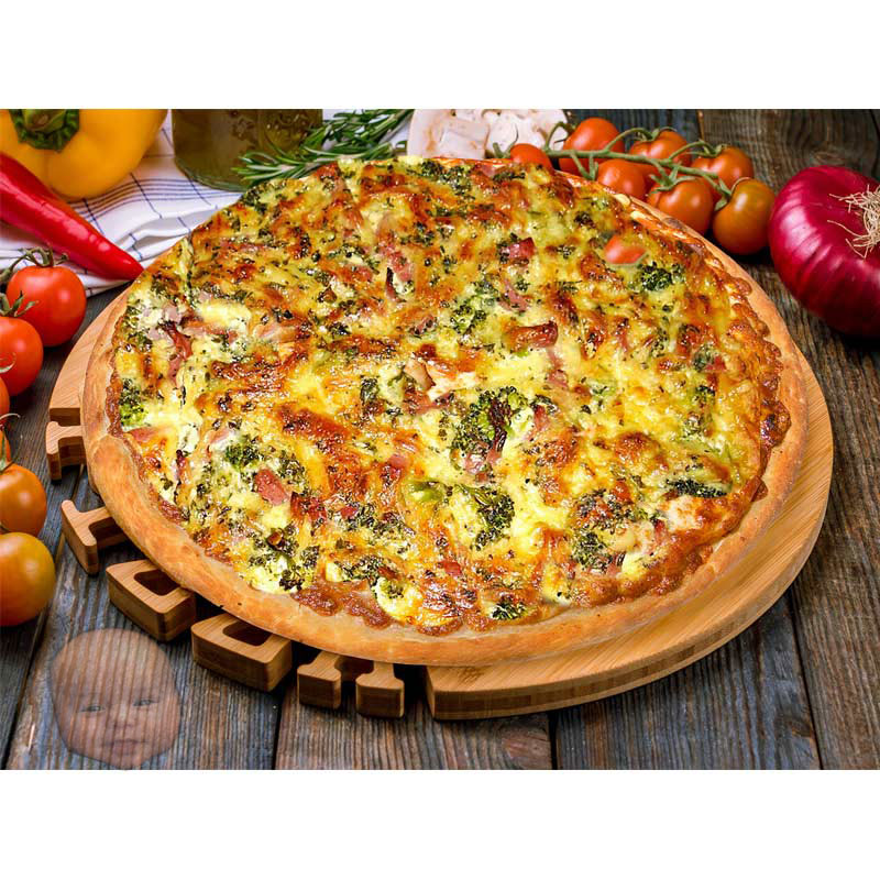 Pizza Asmen mit Sauce Hollandaise, Spinat, Brokkoli, Garnelen, frischer Knobi und Käse