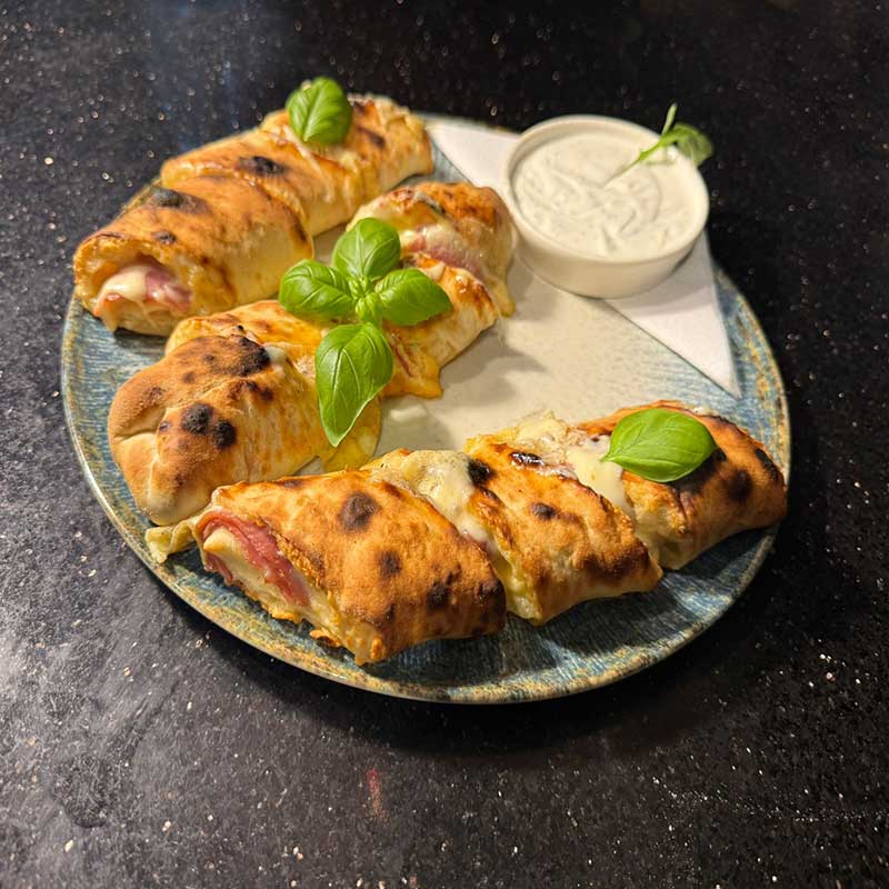 Jedes Brötchen wird frisch aus unserem traditionellen Pizzateig geformt und mit einer großzügigen Portion saftigem Hinterschinken sowie fein schmelzendem Käse gefüllt.und goldbraun gebacken, entfaltet sich im Inneren ein Kern aus heißem, ziehendem Käse und würzigem Schinken.