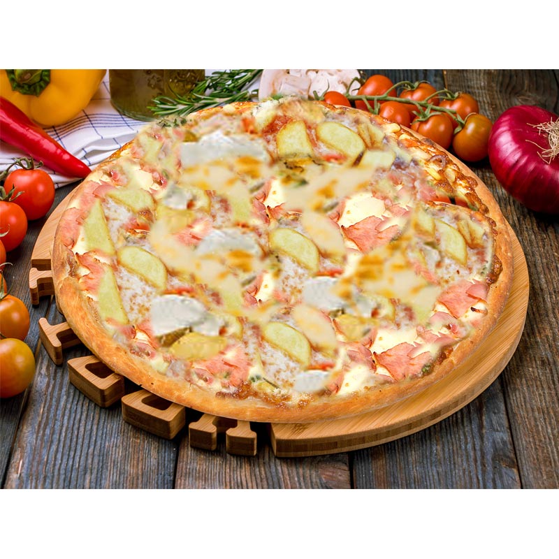 Pizza Europa Belegt mit Schinken, feinen Kartoffelscheiben, Frischkäse und Sauce Hollandaise